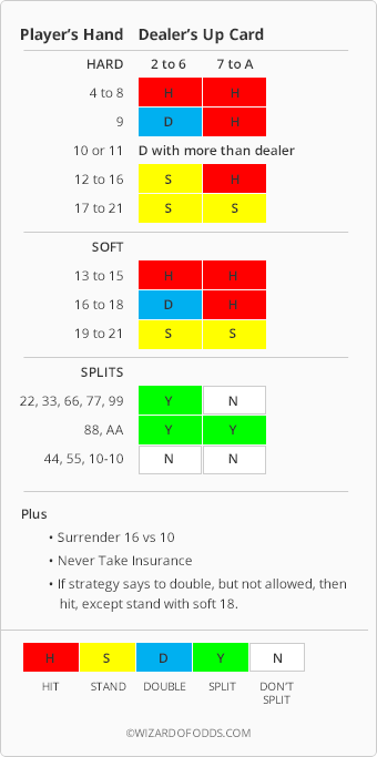 С момента публикации моей книги меня беспокоило, что стоимость ошибок, допущенных при использовании моей простой стратегии, была слишком высока. Поэтому в сентябре 2009 года я разработал следующую «Стратегию волшебника».«Убытки, связанные с несовершенными ходами, составляют всего 0,14% по сравнению с либеральными правилами Лас-Вегас-Стрип. Это стоимость одной раздачи примерно за каждые 12 часов игры. По сравнению с 250 ячейками в базовой стратегии, в стратегии Волшебника их всего 21, как показано ниже.»