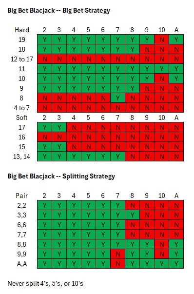 Следующая стратегия показывает, когда следует делать крупную ставку, а когда разделять карты. В противном случае используйте обычную стратегию блэкджека для взятия и остановки игры.