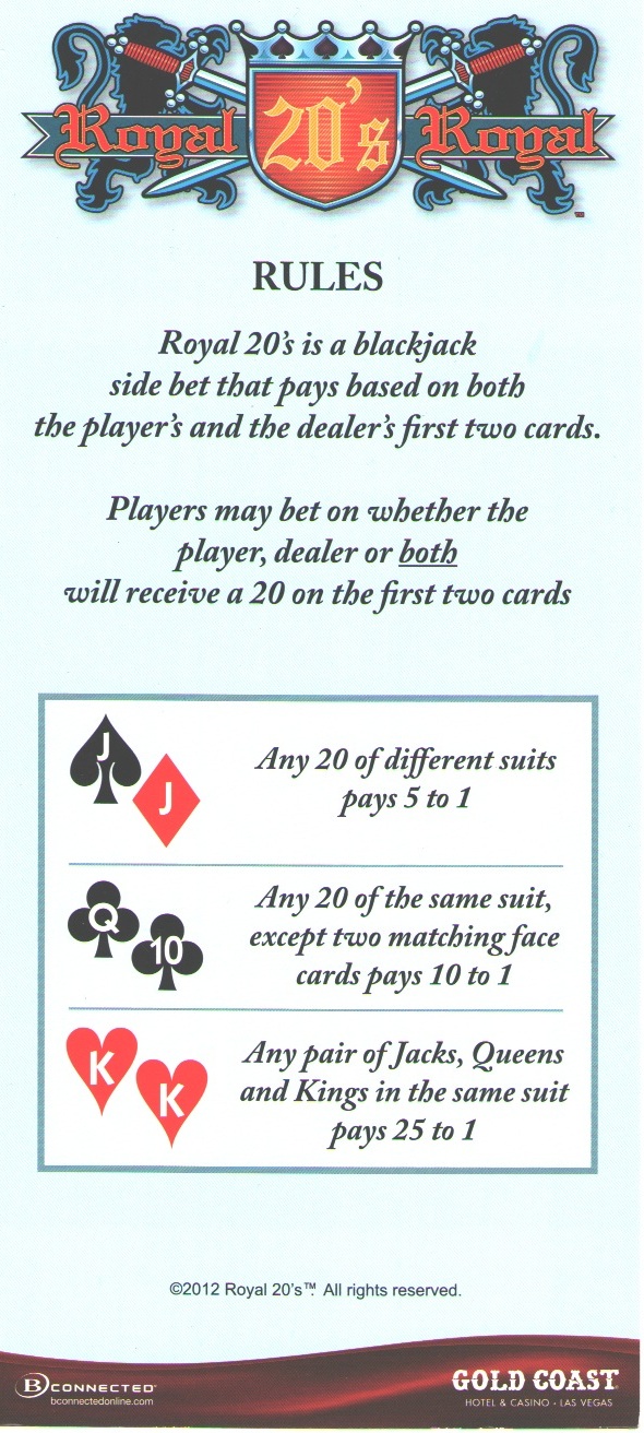 «Королевские 20» — это дополнительная ставка в блэкджеке, основанная на первых двух картах игрока. Если их сумма составляет 20 очков, игрок выигрывает до 25 к 1. Я видел её в казино Cannery в Лас-Вегасе 28 февраля 2017 года, но знаю, что она существует как минимум с 2012 года.