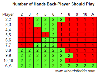 В первой таблице ниже показано количество рук, которые должен разыграть игрок, находящийся сзади. Это основано на бесконечных колодах и остается неизменным независимо от того, берет ли дилер еще карту или останавливается при мягкой 17. Предполагается, что удвоение ставки после разделения разрешено. В таблицу также включены явно неудачные разделения, которые приведены для полноты картины, а не для того, чтобы подразумевать, что игрок, контролирующий ситуацию, должен разделять карты. В таблице также предполагается, что игрок, находящийся спереди, будет продолжать разделять карты, даже если это неудачный ход.