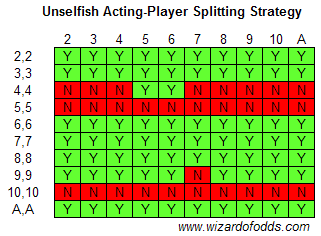 Следующая таблица будет касаться бескорыстного игрока, который разделит карты или не разделит их в зависимости от выгоды игрока, делающего ставку сзади. Это может произойти, если два игрока сговорились, и ставка сзади значительно больше, чем ставка игрока, делающего ставку. В таблице показано, когда игрок, делающий ставку, должен разделить карты, предполагая, что после разделения разрешено удвоение ставки и существует бесконечное количество колод. Не имеет значения, берет ли дилер еще карту или останавливается при мягкой 17.