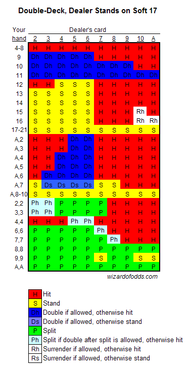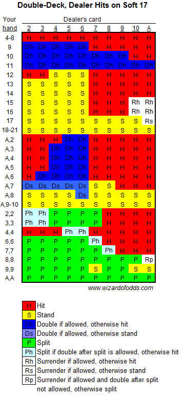Для использования базовой стратегии, посмотрите на свою руку вдоль левого вертикального края и на открытую карту дилера вдоль верхнего края. В обоих случаях туз означает обычную карту. Сверху вниз указаны общие суммы, общие суммы и карты, которые можно разделить. Существует две таблицы в зависимости от того, берет ли дилер еще карту или останавливается при мягкой 17.