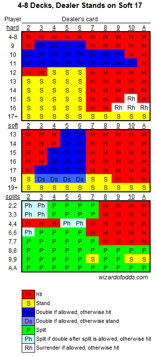 Для использования базовой стратегии посмотрите на свою руку вдоль левого вертикального края и на открытую карту дилера вдоль верхнего края. В обоих случаях туз означает обычную карту. Сверху вниз указаны жесткие суммы, мягкие суммы и руки, которые можно разделить. Руки, которые можно разделить, разделены на две группы в зависимости от того, разрешено ли удвоение ставки после разделения. В играх с несколькими колодами удвоение ставки после разделения обычно разрешено, а в играх с одной колодой это правило может действовать по-разному. В основной части таблицы ячейки обозначены цветом, указывающим на лучшую игру: H = взять карту, S = остановиться, D = удвоить ставку, P = разделить.