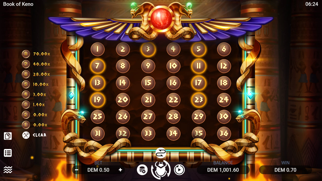 Book of Keno — это разновидность кено от компании Evoplay Entertainment , разработчика игр для интернет-казино. Она работает как обычное кено, за исключением того, что вместо 80 шаров используется 36.