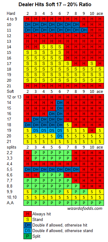 Ниже представлена стратегия для игры в Magic с максимальной ставкой 21, составляющей 20% от ставки в блэкджеке, при условии, что дилер берет карту при мягкой 17.