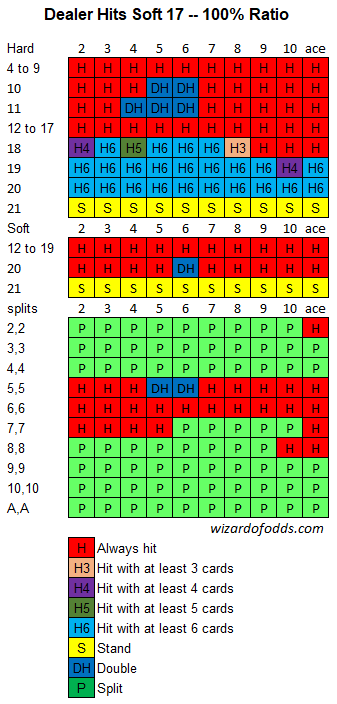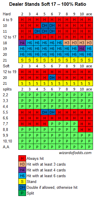 Ниже представлена стратегия для максимальной ставки в Magic 21, составляющей 100% от ставки в блэкджеке, при условии, что дилер берет карту при мягкой 17.