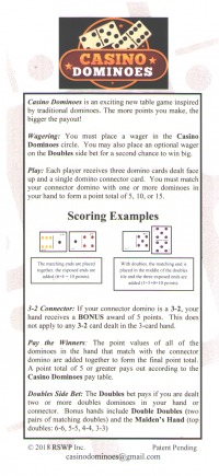 Казино-домино — это первая игра в казино, в которую я видел, если не считать пай-гоу . Впервые я услышал о ней на выставке настольных игр Cutting Edge 2017, где и снял это видео с создателем игры. В игре используются изображения домино на игральных картах. Предлагаются две ставки, и она не требует никаких навыков. Игра началась с полевого испытания в отеле Plaza в Лас-Вегасе 18 сентября 2018 года. Я посетил её два дня спустя.