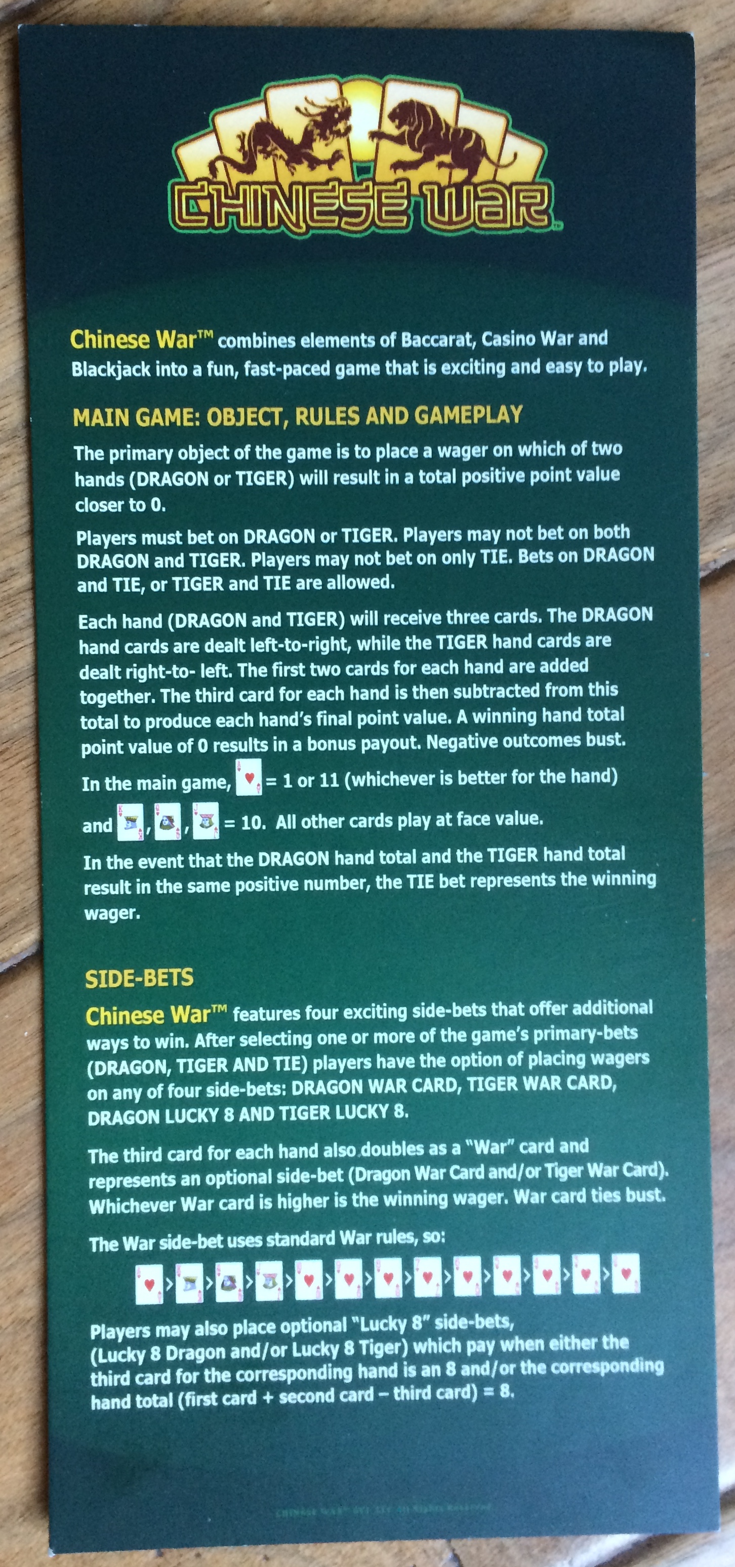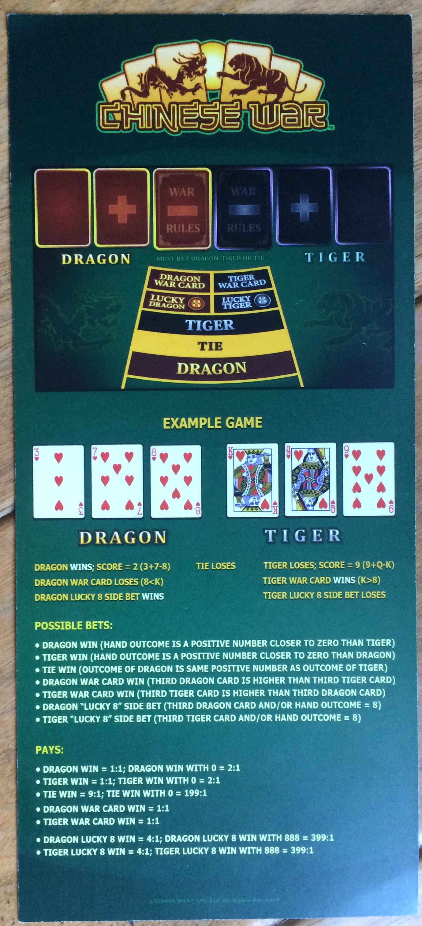 «Китайская война» — это новая игра, которую я заметил во время полевых испытаний в отеле Gold Coast в Лас-Вегасе 25 января 2017 года. Если сравнивать её с другой игрой, то это что-то среднее между «Войной казино» , блэкджеком и баккарой . Доступны семь ставок, основанных на исходе двух комбинаций карт — «Дракон» и «Тигр».