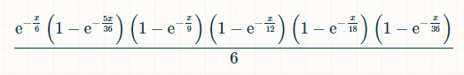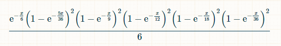 Поскольку выигрышная семерка может выпасть в любой момент времени, вероятность выигрыша — это интеграл этой вероятности по x от 0 до бесконечности. Нам это знать не нужно, но интеграл, до подстановки пределов интегрирования, равен (-6*e^(-x/6)+(72*e^(-(7*x)/36))/7+(9*e^(-(2*x)/9))/2-8*e^(-x/4)-(18*e^(-(5*x)/18))/5-(72*e^(-(11*x)/36))/11+(72*e^(-(13*x)/36))/13+(108*e^(-(7*x)/1) 8))/7+(24*e^(-(5*x)/12))/5-(27*e^(-(4*x)/9))/4-(216*e^(-(17*x)/36))/17-10* e^(-x/2)-(72*e^(-(19*x)/36))/19+(27*e^(-(5*x)/9))/5+(144*e^(-(7*x)/12))/7+ (54*e^(-(11*x)/18))/11-(72*e^(-(23*x)/36))/23-(15*e^(-(2*x)/3))/2-(216*e^( -(25*x)/36))/25-(54*e^(-(13*x)/18))/13+(8*e^(-(3*x)/4))/3+(54*e^(-(7*x)/9) )/7+(72*e^(-(29*x)/36))/29-(72*e^(-(31*x)/36))/31-(9*e^(-(8*x)/9))/8-(24*e ^(-(11*x)/12))/11+(18*e^(-(17*x)/18))/17+(72*e^(-(35*x)/36))/35-e^(-x))/6.