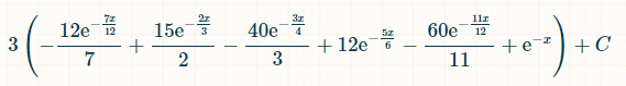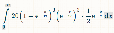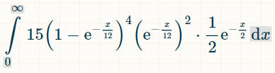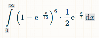 Для интегрирования я рекомендую этот калькулятор интегралов . В поле интеграла введите: "(1-exp(-x/12))^6*(1/2)*exp(-x/2)". В поле пределов интегрирования в параметрах укажите 0 и ∞. Затем нажмите "Перейти".Это позволит вам получить интеграл, приведенный ниже: