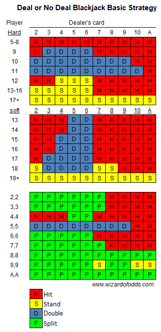 Ниже приведена правильная базовая стратегия для вышеуказанных правил. Если за столом требуется удвоение ставки, и у вас три или более карт, то берите ещё одну карту, за исключением случаев с мягкой 18, и останавливайтесь.