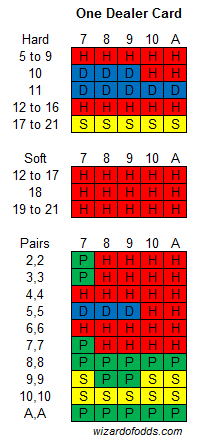 В следующей таблице показана стратегия игры против дилера с одной открытой картой, которая аналогична стратегии в обычном блэкджеке для четырех-восьми колод, когда дилер берет карту при мягкой 17.