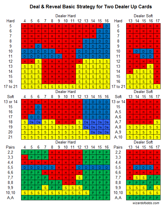 В целях экономии времени я проанализировал игру Deal & Reveal в Excel, используя предположение о бесконечной колоде и бесконечном повторном разделении карт. Это привело к преимуществу казино в 1,165%. Затем я сравнил свои результаты с математическим отчетом Даниэля Дейла, который провел комбинаторный анализ. Наше преимущество казино и стратегия оказались очень близки, и я предполагаю, что любые различия были обусловлены моим предположением о бесконечной колоде. Стратегия и преимущество казино, приведенные здесь, взяты из работы Даниэля, которому я доверяю.