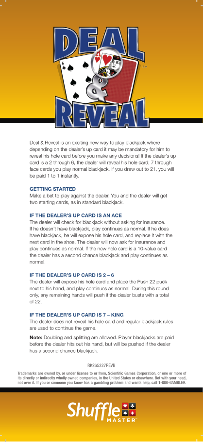 Игра Deal & Reveal основана на традиционных правилах блэкджека с учетом особенностей и изменений, перечисленных ниже. Если два правила противоречат друг другу, применяйте то, которое указано первым.