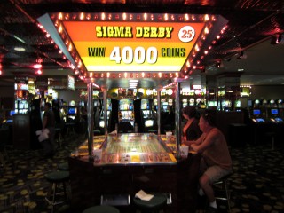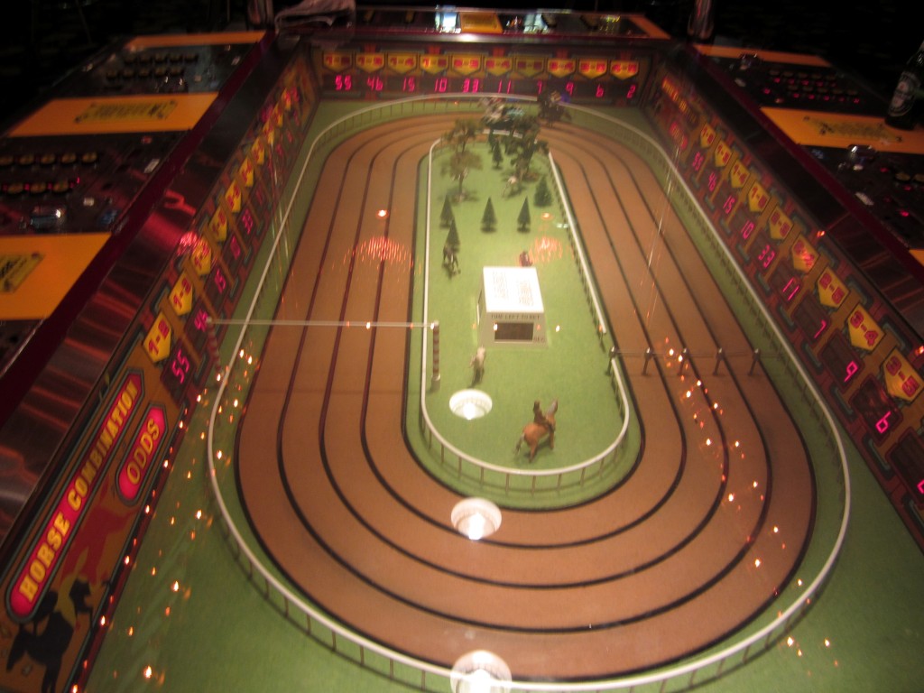 Дерби — это электронная игра в скачки. От одного до десяти игроков сидят вокруг ипподрома и наблюдают за тем, как 5 лошадей соревнуются в забегах один за другим. Ставка может составлять всего 25 центов, а перерыв между забегами — около 90 секунд. Это вполне может стать неплохим способом скоротать время — если, конечно, вам удастся найти такую игру. Количество подобных игр быстро сокращается. Это лишь вопрос времени, когда игра полностью исчезнет.