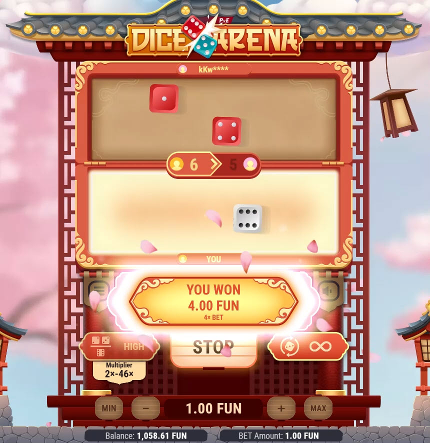 На изображении выше я поставил 1 доллар в режиме «высокий», то есть один кубик против двух кубиков дилера. Моя шестерка перебила сумму 5 у дилера. Мой выигрыш составил 4 к 1.