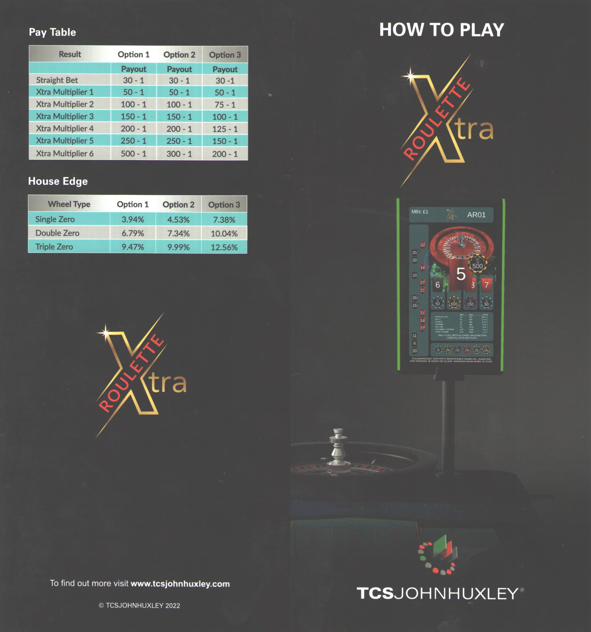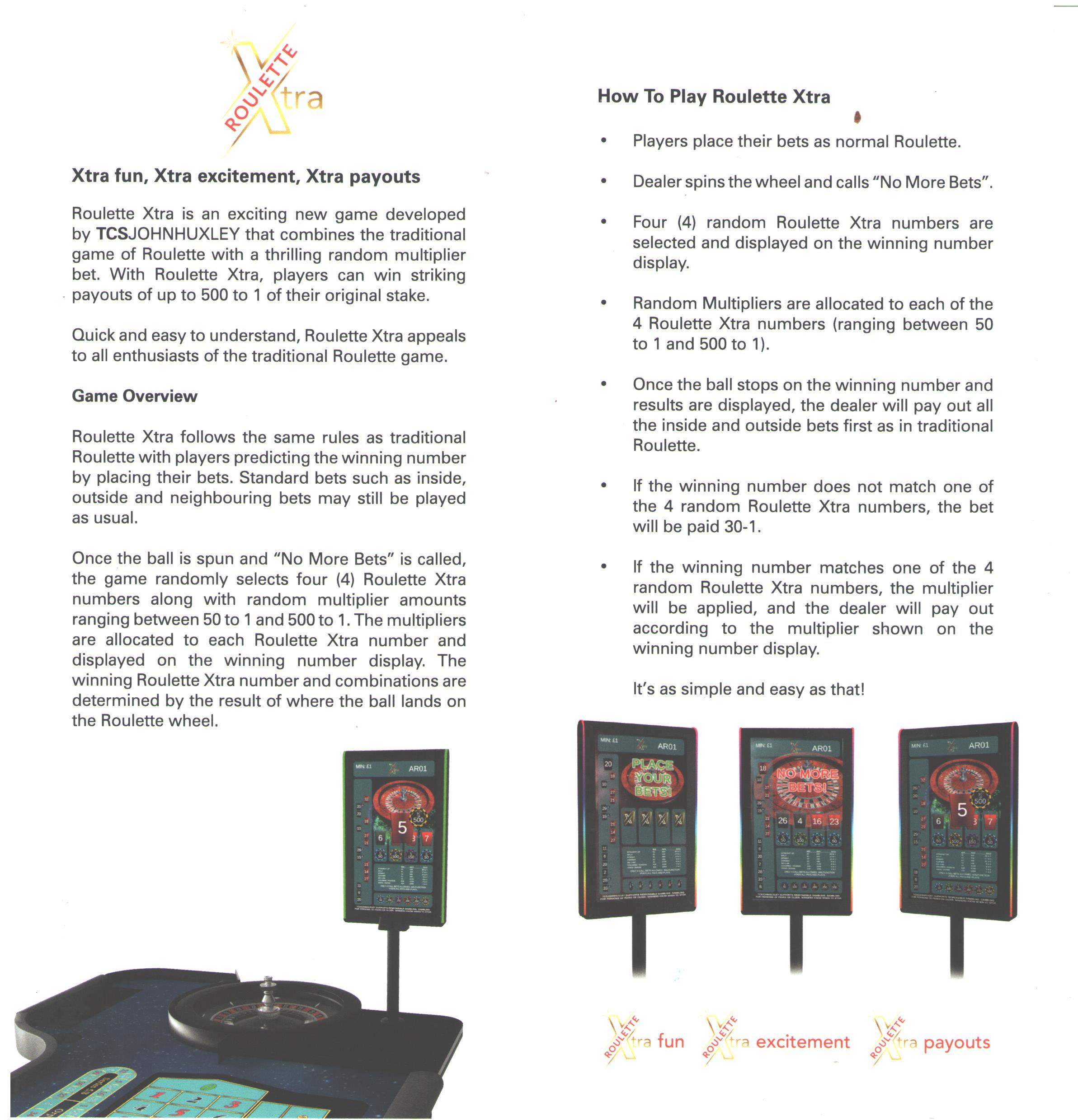 Xtra Roulette — это разновидность рулетки от производителя колес TCS John Huxley. В нее играют так же, как и в обычную рулетку, за исключением ставок на отдельные числа. При ставках на отдельные числа выигрыш может составлять от 30 до 200 или максимум 500 к 1, в зависимости от используемой версии.