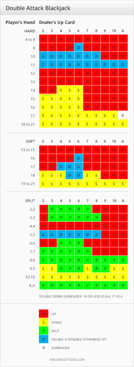 Ниже представлена основная стратегия для игры в блэкджек с двойной атакой. «Сдача после удвоения ставки» означает, когда следует сдаться после удвоения ставки.