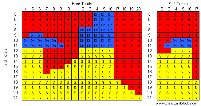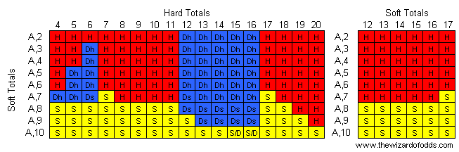 В следующих таблицах представлена основная стратегия двойной экспозиции, когда дилер берет еще одну карту при мягких 17. Для использования таблиц найдите комбинацию карт игрока в левом столбце и комбинацию карт дилера в верхней строке.