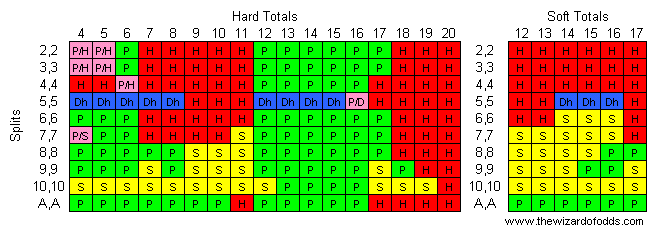 - P/H = Разделить, если позволить удвоиться после разделения, в противном случае — попасть в цель.