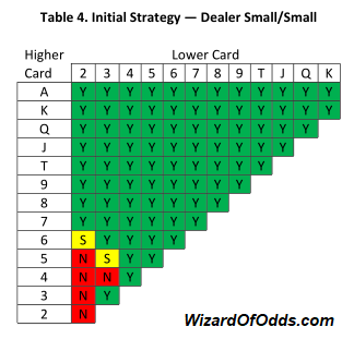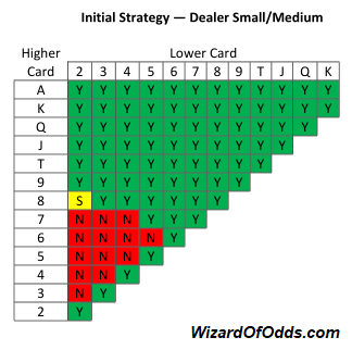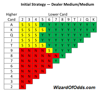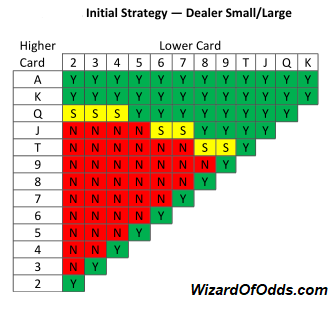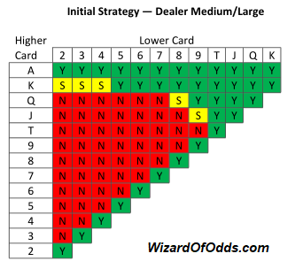 В следующих шести таблицах показана стратегия на первом этапе принятия решения, в соответствии со всеми шестью возможными комбинациями диапазонов двух закрытых карт дилера. Если стратегия предполагает крупное повышение ставки, оно всегда должно составлять 3-кратную ставку анте. Условные обозначения следуют за шестой таблицей. Щелкните любое изображение для увеличения.