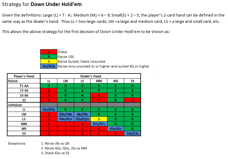 Даун Андер Холдем — это азартная игра в казино, основанная на покере, в которой игрок обладает частичной информацией о закрытых картах дилера. В частности, он знает, относятся ли их карты к низкому, среднему или высокому диапазону. У игрока есть одна возможность повысить ставку, чем раньше он это сделает, тем больше он может повысить ставку, и побеждает тот, у кого более сильная комбинация.