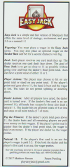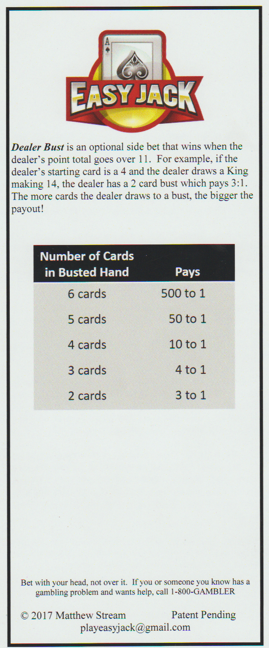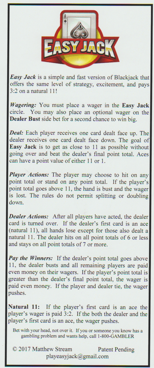Easy Jack можно условно описать как вариант блэкджека, где цель — приблизиться к 11 очкам ближе, чем у дилера, не превышая эту цифру. Игра была создана Мэтью Стримом и прошла тестирование в Harrah's в Лас-Вегасе 21 июня 2017 года. Я видел и играл в неё там 30 июня 2017 года.
