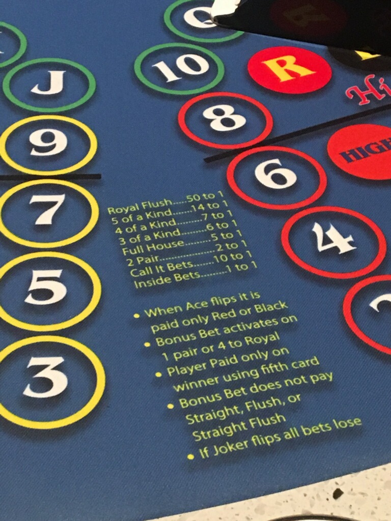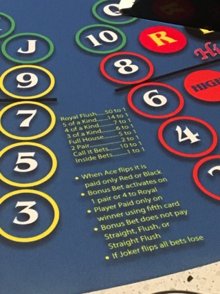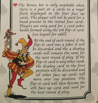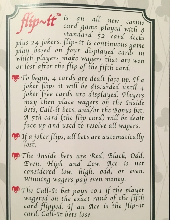 - После завершения приема ставок раздается пятая карта «Flip-It» лицевой стороной вверх, чтобы разрешить все ставки. Если эта пятая карта окажется джокером, все ставки проигрывают.