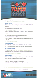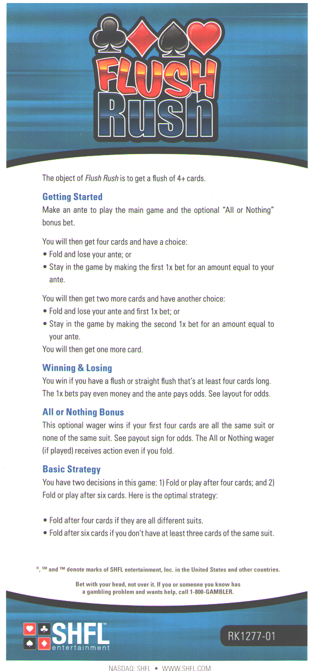 Flush Rush — это новая настольная игра, которую я впервые заметил в казино D в Лас-Вегасе в мае 2014 года. Игра сочетает в себе акцент на флешах в High Card Flush и структуру ставок «повышение или фолд» в Mississippi Stud . Чем длиннее флеш или стрит-флеш в финальной раздаче игрока, тем больше он выигрывает.