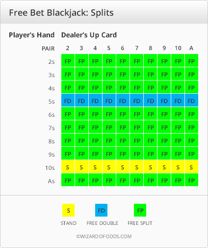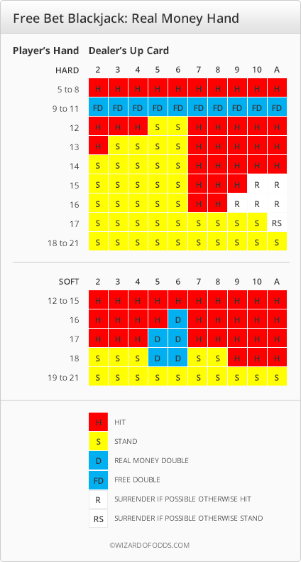 Стратегия зависит от того, играете ли вы на реальные деньги или на бесплатную ставку. Разница есть, потому что ничья так же плоха, как и проигрыш на бесплатной ставке, поэтому требуется более агрессивная стратегия. В следующих трех таблицах показана стратегия для раздачи на реальные деньги, раздачи на бесплатную ставку и пар соответственно.