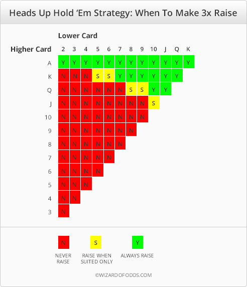 Игрок должен делать 3-кратное повышение ставки с любой парой, кроме двоек. В противном случае, используйте следующую таблицу, которая показывает, когда следует делать большое 3-кратное повышение ставки.