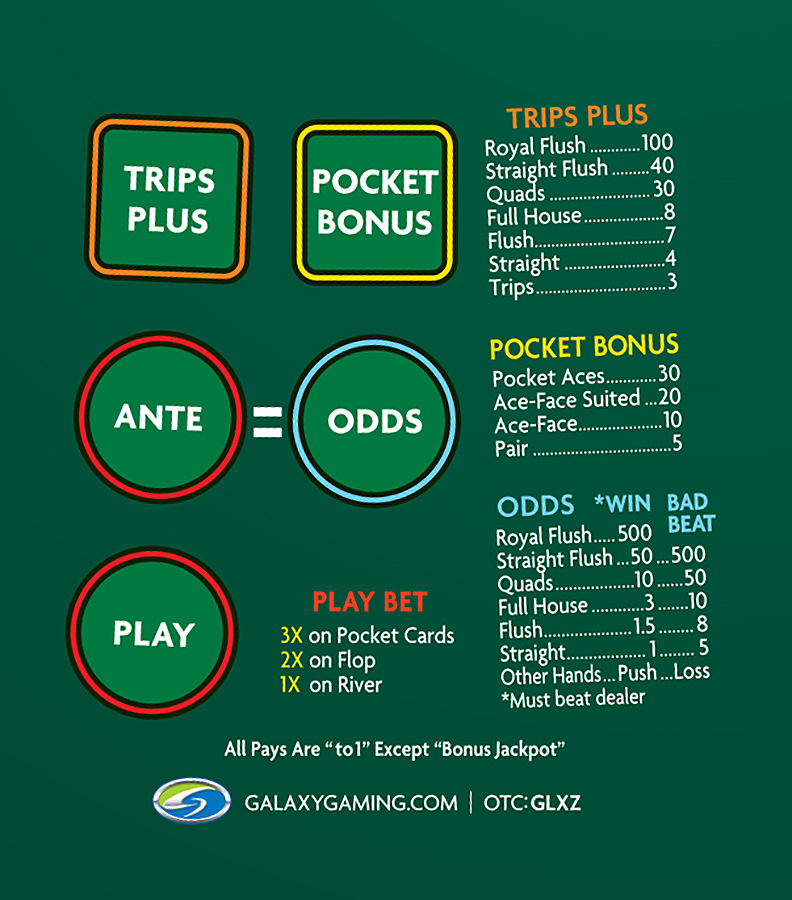 Рука Таблица выплат 1 2 3 4 Прямой смыв 500 500 500 500 Квадрокоптеры 50 50 50 25 Аншлаг 10 10 10 6 Румянец 8 6 5 5 Прямой 5 5 4 4 Все остальные Потеря Потеря Потеря Потеря - Кроме того, есть две дополнительные ставки, выплаты по которым производятся только на основе карт игрока: Trips Plus и Pocket Bonus. Эти дополнительные ставки объясняются после анализа основной игры.