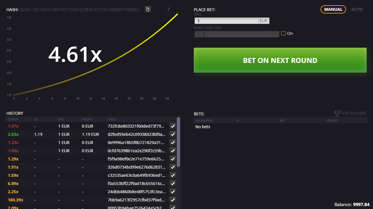 - Игра обеспечивает честность, присваивая каждому раунду хеш-код, который игрок может проверить после игры, чтобы убедиться в предопределенности исхода до совершения каких-либо ставок.