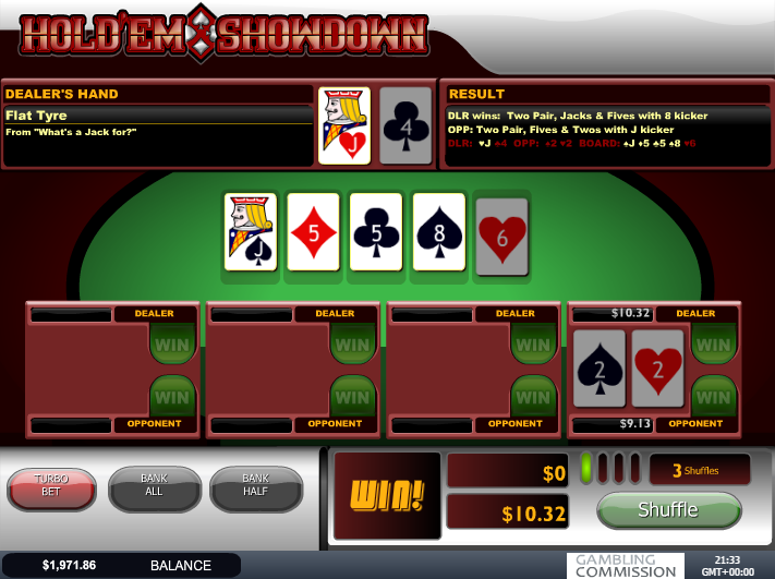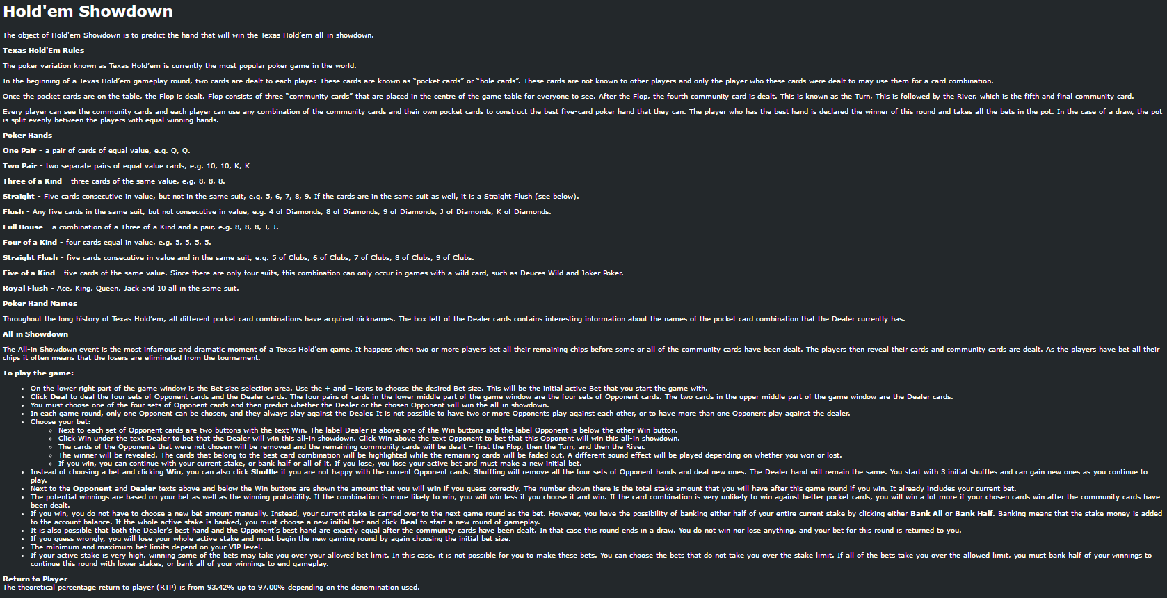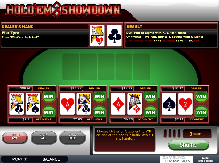 Hold 'Em Showdown — это покерная игра от Playtech. В ней определяется победитель в поединке по техасскому холдему между двумя стартовыми раздачами. Указанные коэффициенты соответствуют вероятности выигрыша.