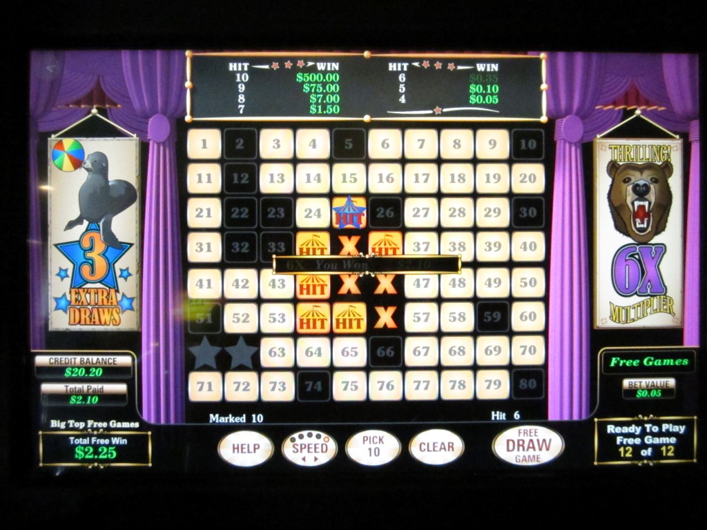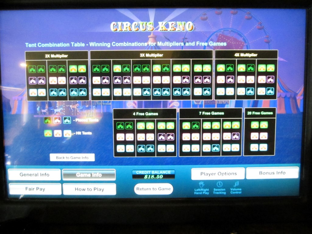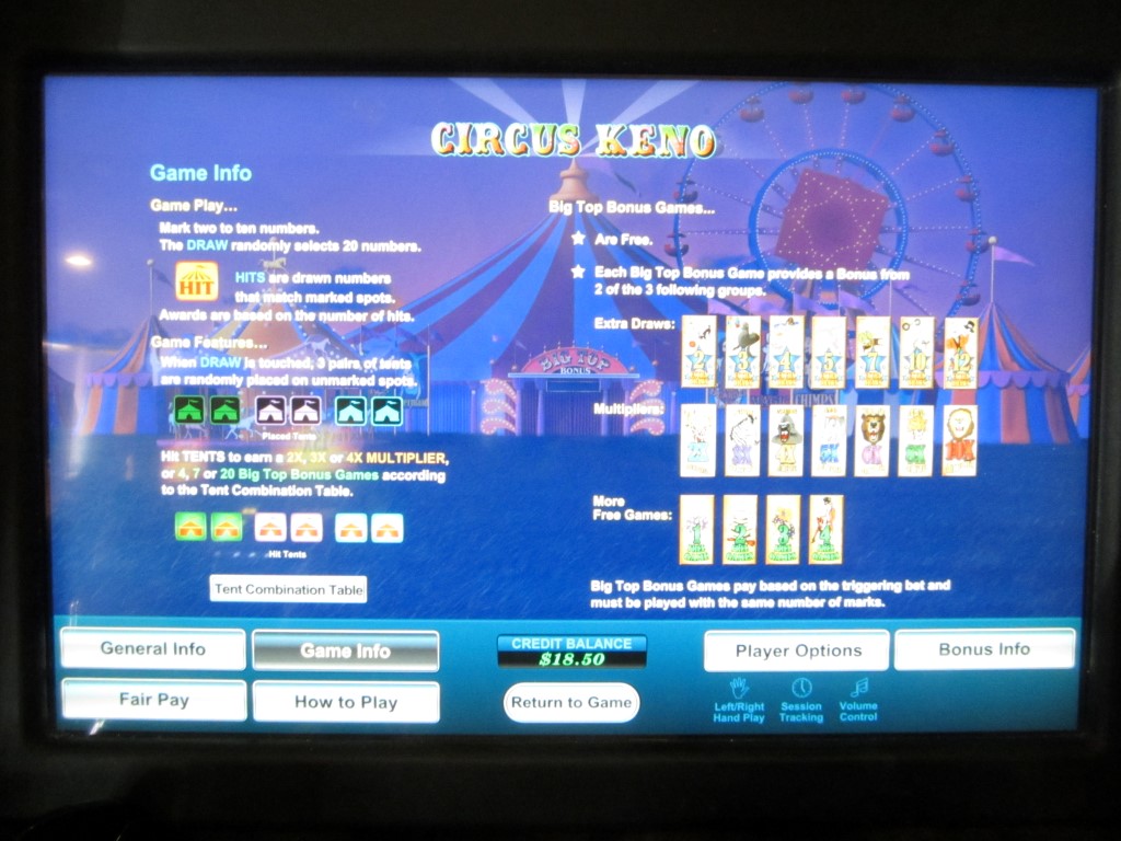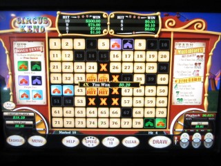 Circus Keno — это игра, которая встречается на многоигровых автоматах производства U1 Gaming. Я видел такие автоматы в казино Las Vegas Club, Rampart и Dotty's в Лас-Вегасе. Суть Circus Keno заключается в том, что после того, как игрок выбирает свои числа, игра случайным образом выбирает шесть цирковых шатров из оставшихся чисел. Попадая по цирковым шатрам с 20 выпавшими числами, игрок может получить множители или бонус в виде бесплатных вращений.