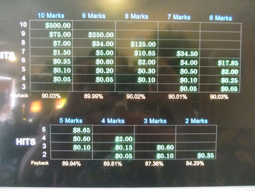 В следующей таблице показана таблица выплат для основной игры при выборе девяти чисел и ставке в 2 доллара, без учета множителей и бонуса.