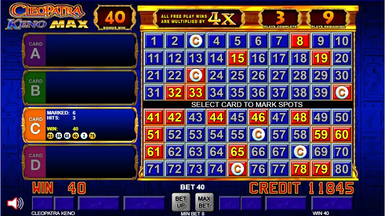 Cleopatra Max — это вариант кено, в котором, если последний вытянутый шар приносит выигрыш, игрок участвует в бонусном раунде бесплатных игр. В бонусном раунде игрок получает 12 бесплатных игр со случайным множителем от 3x до 5x.