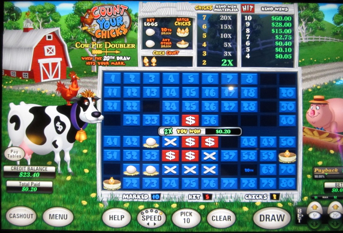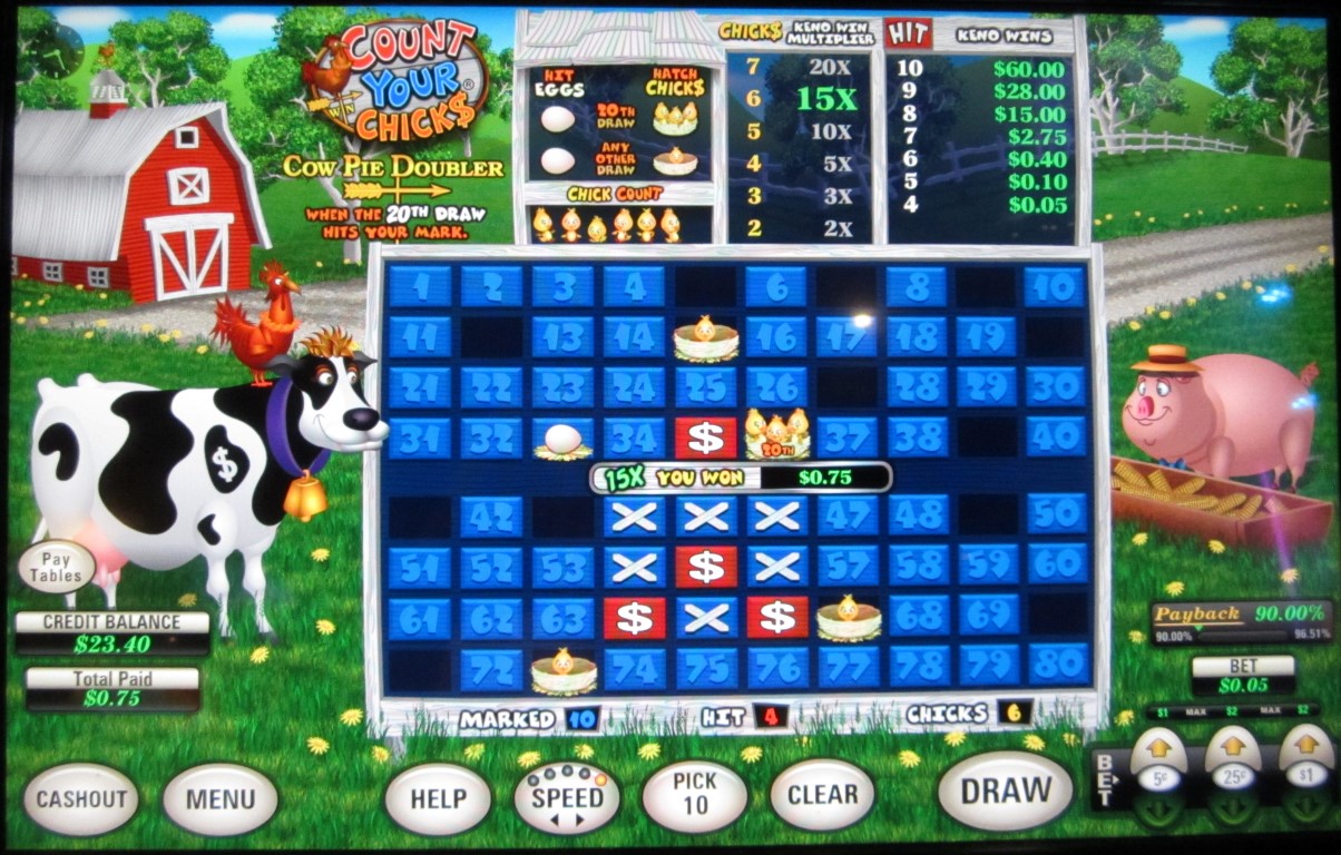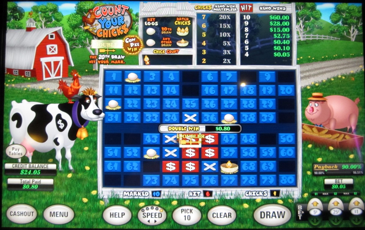 Count Your Chicks — это игра, основанная на кено, которая встречается на многоигровых автоматах производства U1 Gaming . Я видел такие автоматы в казино Las Vegas Club, Rampart и Dotty's в Лас-Вегасе. Суть игры Count Your Chicks заключается в том, что на пять чисел, не выбранных игроком, случайным образом помещается яйцо. Если выпадение 20-го шара совпадает с любым из них, из яиц вылупляются цыплята. За вылупление двух или более цыплят игрок получает множитель. Для 20-го шара действуют особые правила.