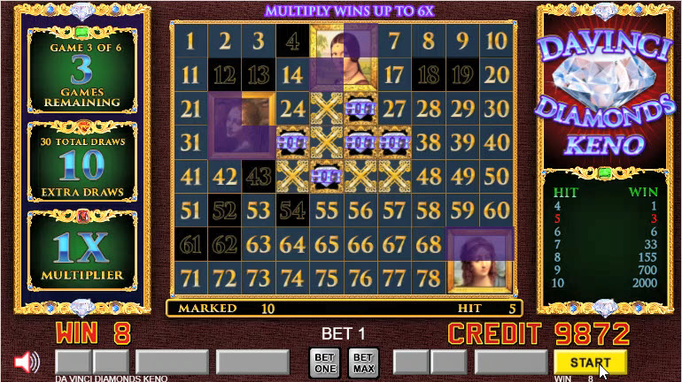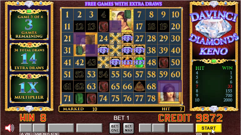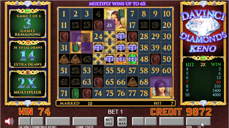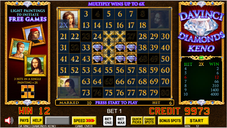 Davinci Diamonds — это разновидность кено. Впервые я заметил её в 2021 году на VideoPoker.com и в Resorts World в Лас-Вегасе. В дополнение к обычным правилам кено, в игре на поле с числами размещаются картинки размером 2x2. Игрок может выиграть множители и бонусный раунд, если закроет достаточное количество плиток с картиной. В бонусном раунде игрок получает бесплатные вращения, в которых, поймав числа на картинках, выигрывает дополнительные шары.