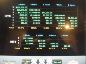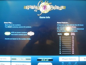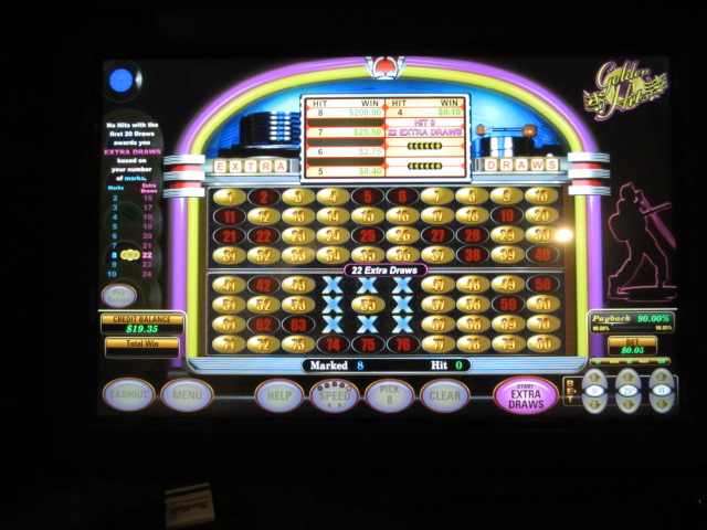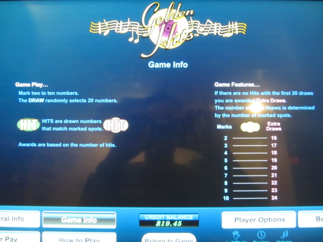 Golden Hits — это игра в кено, которая устанавливается на многоигровых автоматах производства U1 Gaming . Я видел такие автоматы в казино Las Vegas Club, Rampart, El Cortez и Dotty's в Лас-Вегасе. Суть Golden Hits заключается в том, что если игрок не набирает ни одного шара, игра выбирает еще 16-24 шара в зависимости от количества выбранных игроком шаров.