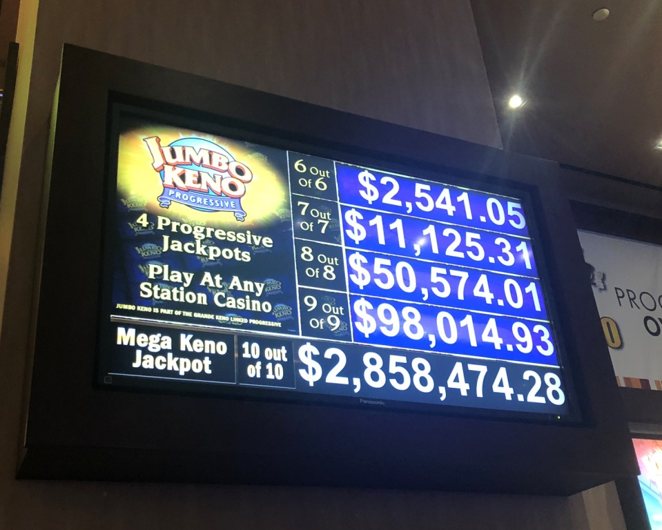 В казино Stations в Лас-Вегасе предлагается пять игр в кено с прогрессивным джекпотом. Четыре из них — игры с выбором 6, 7, 8 и 9 — называются «Jumbo Keno Progressive». Пятая игра, с выбором 10, называется Mega 10. В правилах указано, что игра Mega 10 не является эксклюзивной для казино Stations, но может быть доступна и в других местах в Неваде. Во всех играх Jumbo Progressive ставки составляют 1 доллар, а в игре Mega 10 — 1,50 доллара.