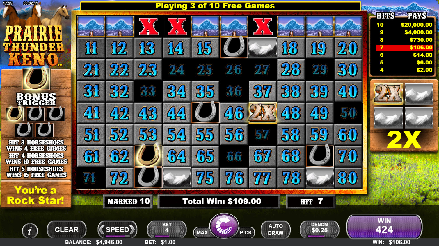На изображении выше подковы были размещены на числах 32, 36, 73, 77 и 79. Четыре из пяти подков были выбиты (все, кроме одной на числе 36), что запустило 10 бесплатных вращений.