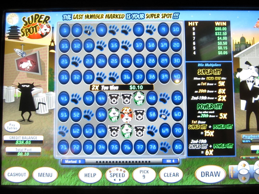 Super Spot — это игра на основе кено, которая устанавливается на многоигровых автоматах производства U1 Gaming. Я видел такие автоматы в казино Las Vegas Club, Rampart и Dotty's в Лас-Вегасе. Super Spot похожа на Power Keno , за исключением того, что здесь есть два возможных множителя: один за попадание по последнему выбранному числу, а другой — за попадание по любому элементу на последнем шаре.