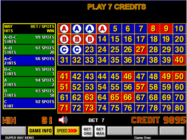 Super Way Keno — это способ игры в кено с семью картами, каждая из которых содержит от 2 до 9 карт. Игрок выбирает четыре числа для карты A, три для карты B и два для карты C. Также игрок выкладывает еще четыре карты, которые представляют собой комбинации чисел, выбранных на картах A+B, A+C, B+C и A+B+C.