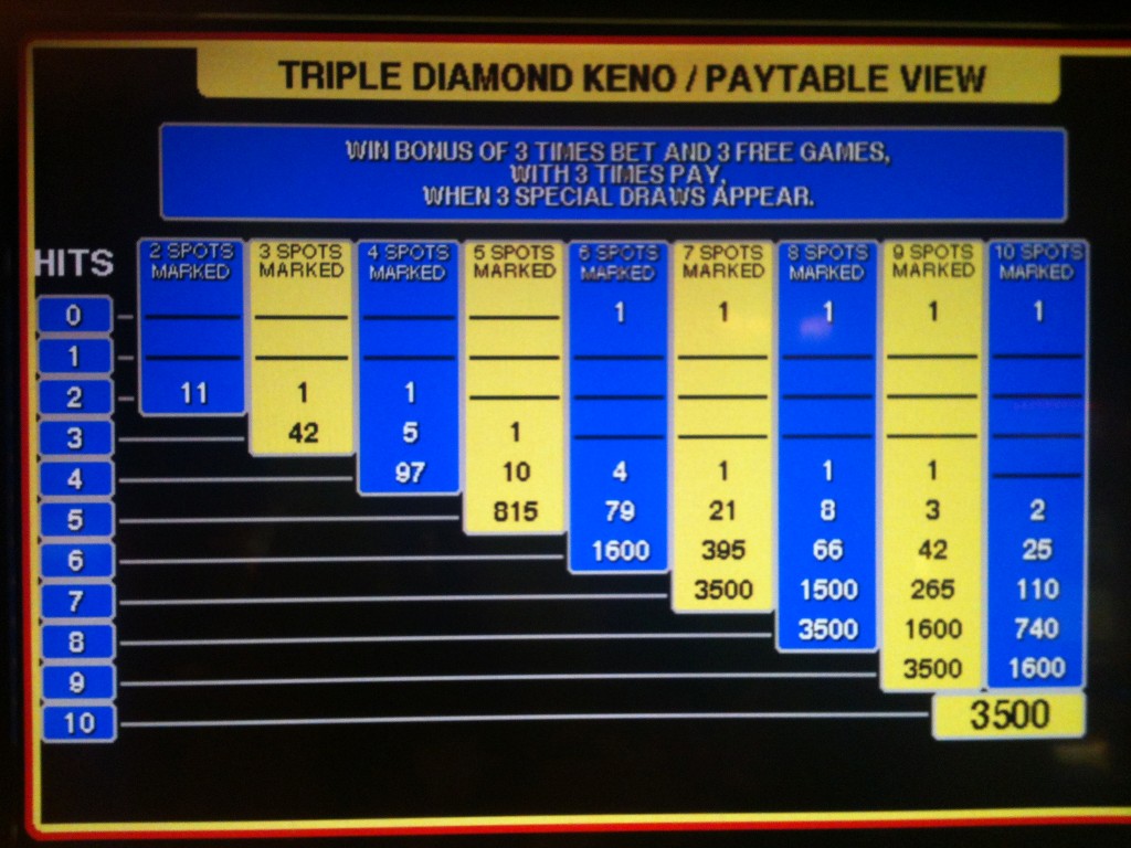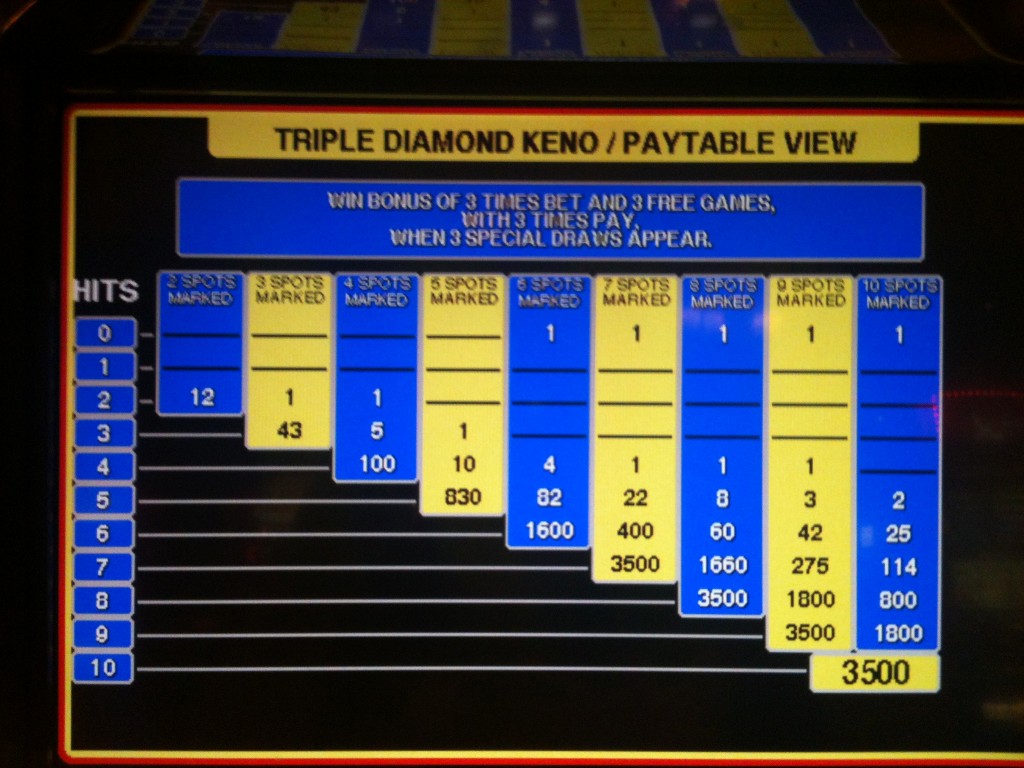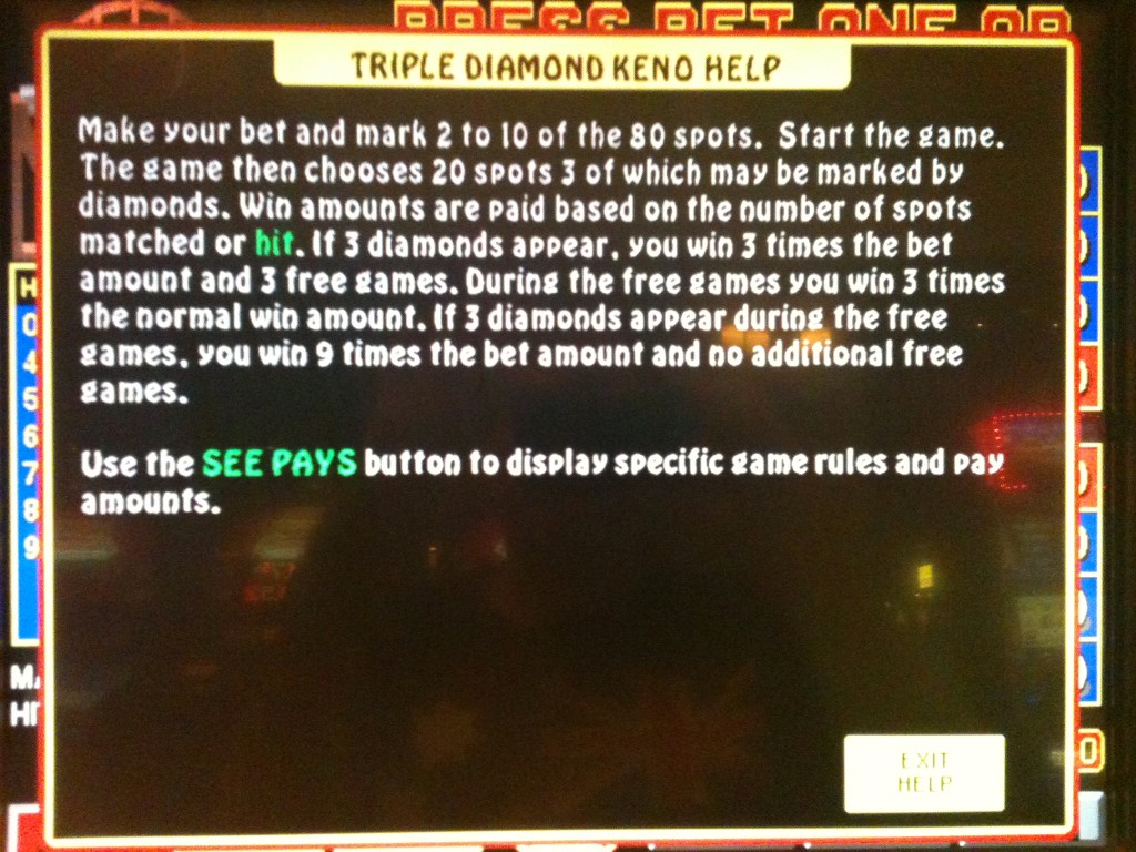 В настоящее время игра довольно устарела и её трудно найти. Я бы предположил, что ваши шансы на успех выше на небольших электронно-лучевых консолях GameMaker. По теории игра похожа на Caveman Keno , но графика не так впечатляет, что, вероятно, и является причиной исчезновения Triple Diamond Keno.