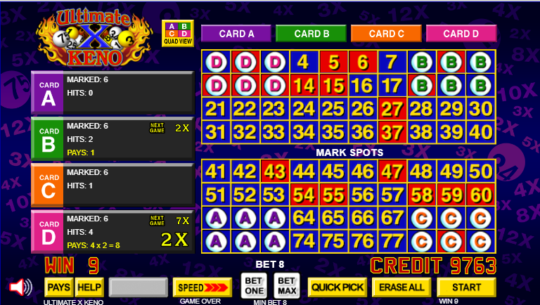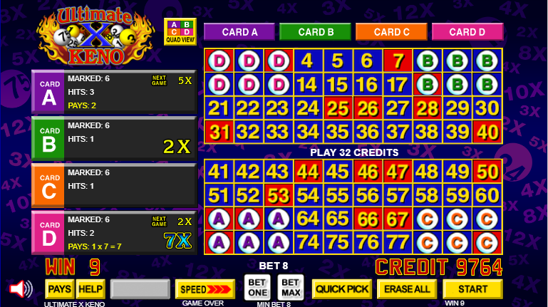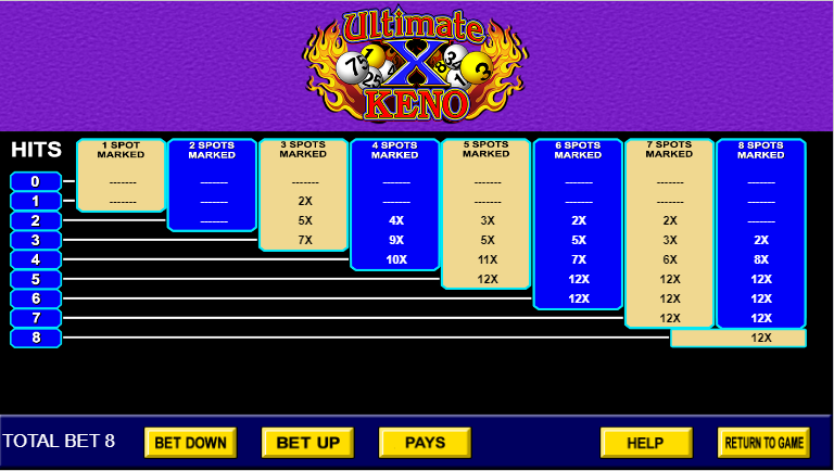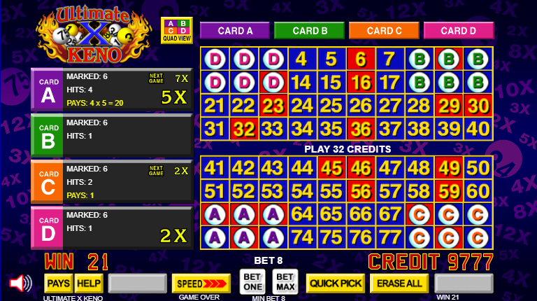 Ultimate X Keno — это обычная игра в кено с четырьмя картами, но помимо мгновенных выигрышей игрок также получает множители на следующую игру на той же карте. Для этого игроку необходимо удвоить свою ставку. Выигрыш в текущей игре рассчитывается как половина общей суммы ставки.