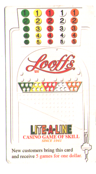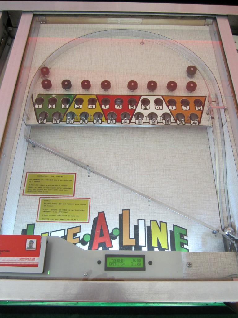 Lite-a-Line — это сочетание пинбола и бинго. Пинбол похож на бинго тем, что шарик запускается с помощью поршня, но в бинго нужно, чтобы шарик засветил пять ячеек подряд, чтобы выиграть. По мере того, как шарик проходит через 25 отверстий на доске, соответствующие ячейки на карточке размером пять на пять подсвечиваются. Игроки обычно делают ставку в 1 доллар, а победитель получает 15 долларов.