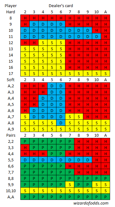 Эта базовая стратегия предназначена для таблицы выплат 2. Единственное отличие от таблицы выплат 1 заключается в том, что вы должны остановиться на «мягкой» 19 против 6, а не удваивать ставку.