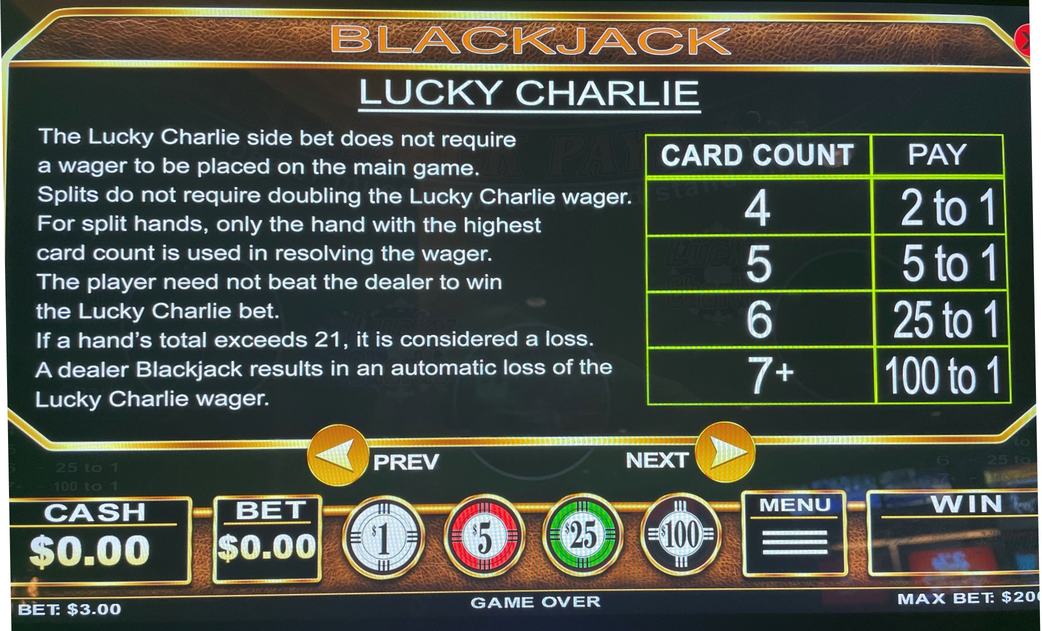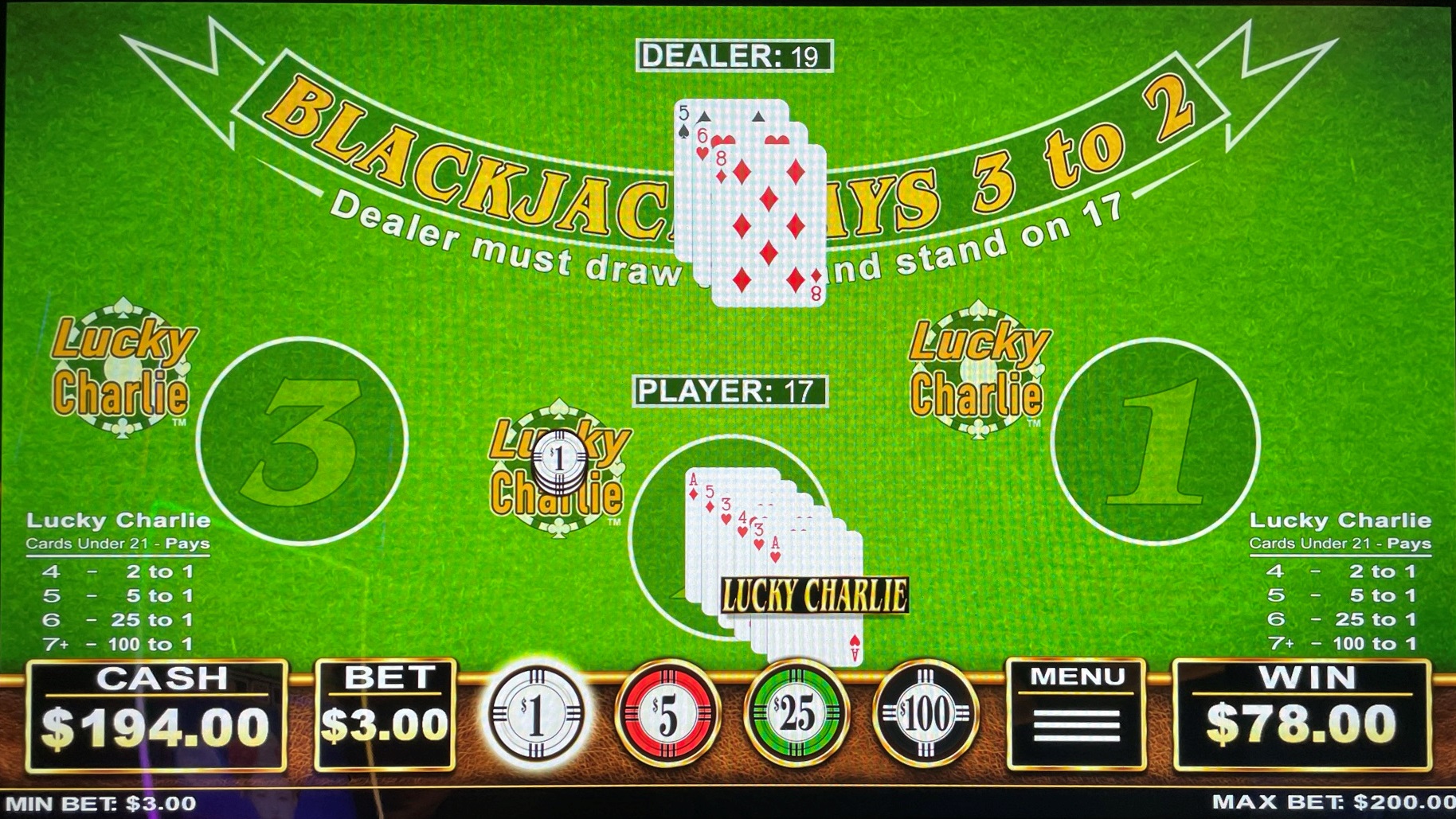 - Если у игрока или дилера блэкджек, то игрок не может брать карту, и ставка «Счастливчик Чарли» считается проигрышной.