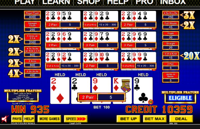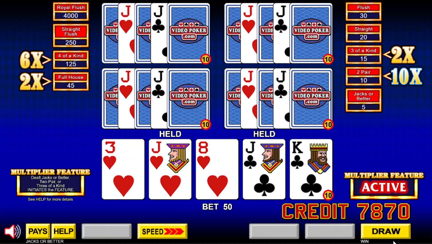 - В играх типа Jacks or Better, если игроку раздают валеты или карты лучше, две пары или три одинаковые карты, то он может претендовать на множители, если улучшит свою комбинацию при пополнении до определенных значений.